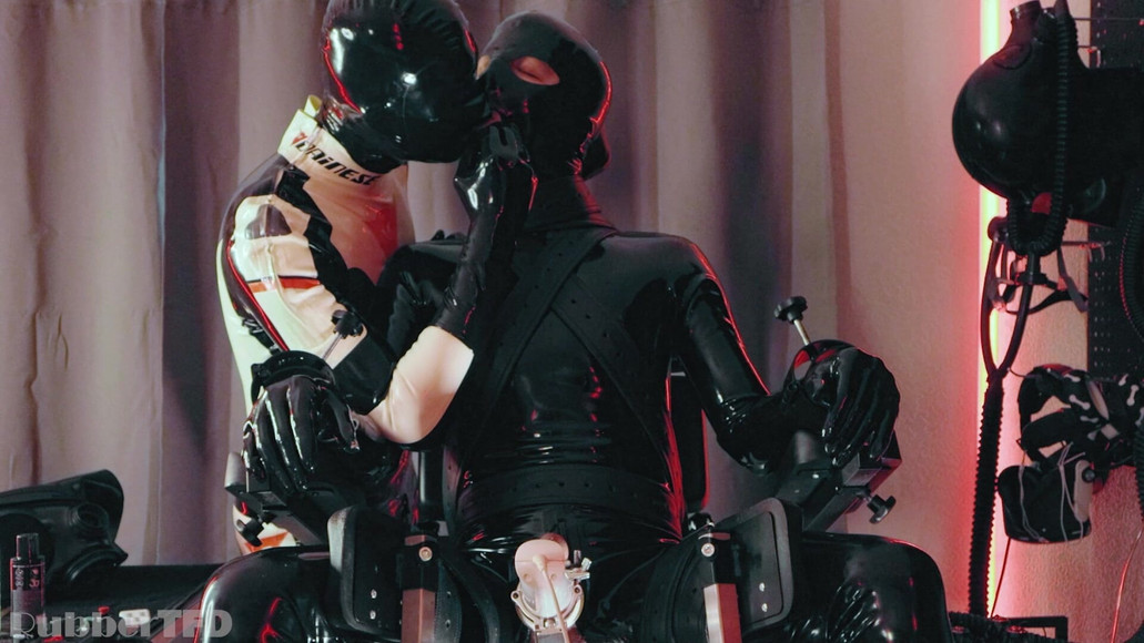 So Pup Devious volunteered to be a test subject in the drone station, trying to get used to the bondage chair and the fucking machine before completely encased in full rubber with more machines!