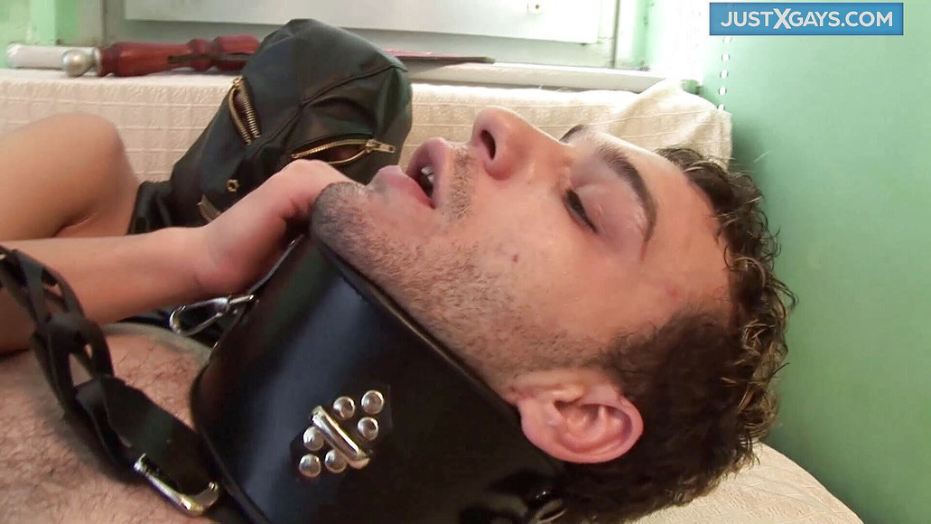 年上の男は、オーラルSMプレイのためにゲイの男の子をバインドします
