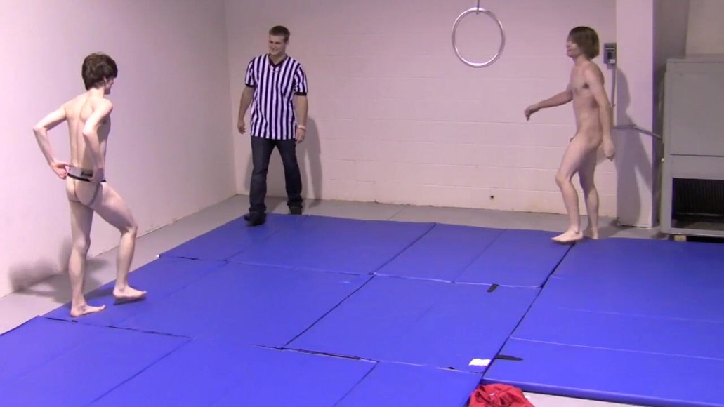 Troy and Tyler continue their strip-tease as they squirm across the wrestling mats. Whereas the boys seemed rather timid wrestling fully clothed, the aggression builds as they are stripped down to nothing, exposing their tense, exhausted muscular frames. They seem much more comfortable battling it out sans the restrictive clothing. Troy develops an interesting strategy as he moves on all fours, tipping his ripe little ass into the air, but Tyler has no problem entangling their butt-naked bodies to his advantage. The match is coming to a close, but who is winning and what the special prize for the victor is…….nobody knows. Next Week: The winner and special prize are revealed!