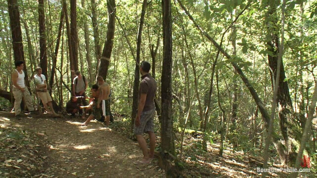 Josh West blindfolds and ties DJ to a tree in the woods. To make things more interesting, he puts an electric buttplug in DJ’s ass and plays with him using a remote control. Hikers find DJ naked and tied up, and they use the boy. They drag DJ into camp and turn him into a service slave. He is made to crawl around the campfire serving drinks and sucking cocks. The crowd tosses the camp whore into the hot tub, gang fuck him and spray his face and mouth with their hot cum. Satisfied, they make him crawl back into the woods where he belongs.