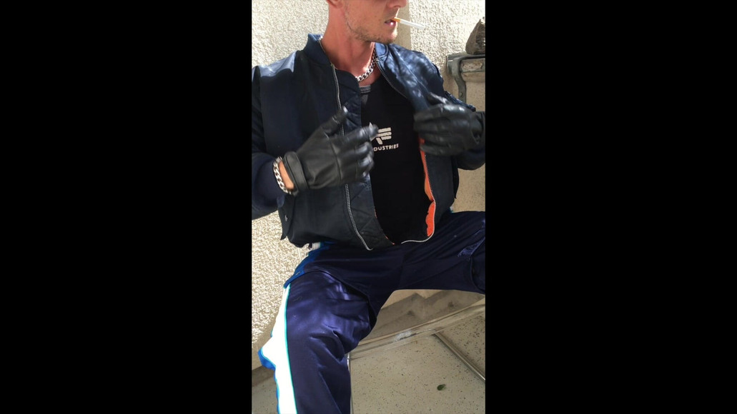 chav wearing fetish clothes smokes hard spits leather gloves bomberjacket lonsdale alpha sunglasses proll reebok trainers
