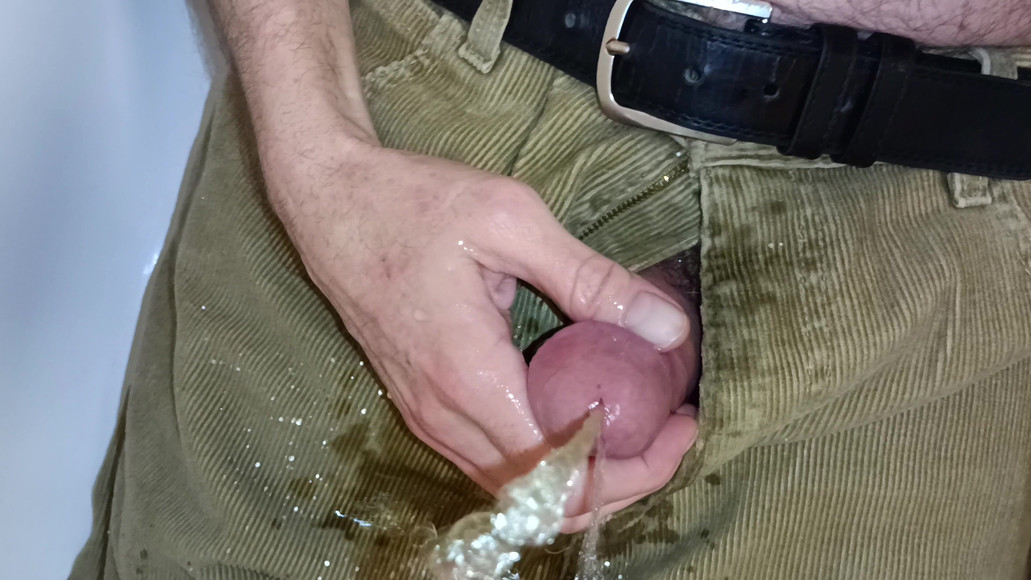 Wearing a pair of cords gifted to me by a dear fan... Here I am in the bath wearing cords, close up, slowly pissing, wetting pants and getting harder, still pissing with excitement building until I cum, then pissing again until the cords are soaked.