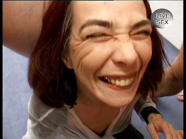 Slutty mature brunette gets cum in mouth by multiple cocks in a gangbang.