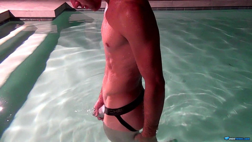 Well hung hottie Jake Parker rubs his cock poolside in his board shorts then strips down to his Andrew Christian white jockstrap, takes a dip in the pool making his cock show through the white cotton. Jake gets out and strokes his massive 10 inch cock until it explodes!