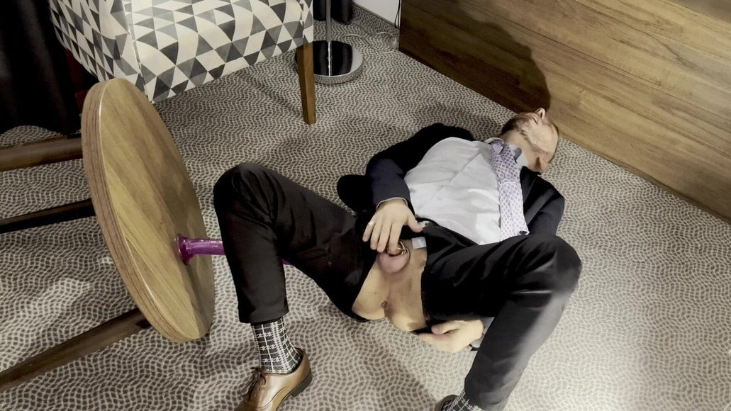 suited men with open crotch is pissing like a dog and rides the dildo and cums handsfree